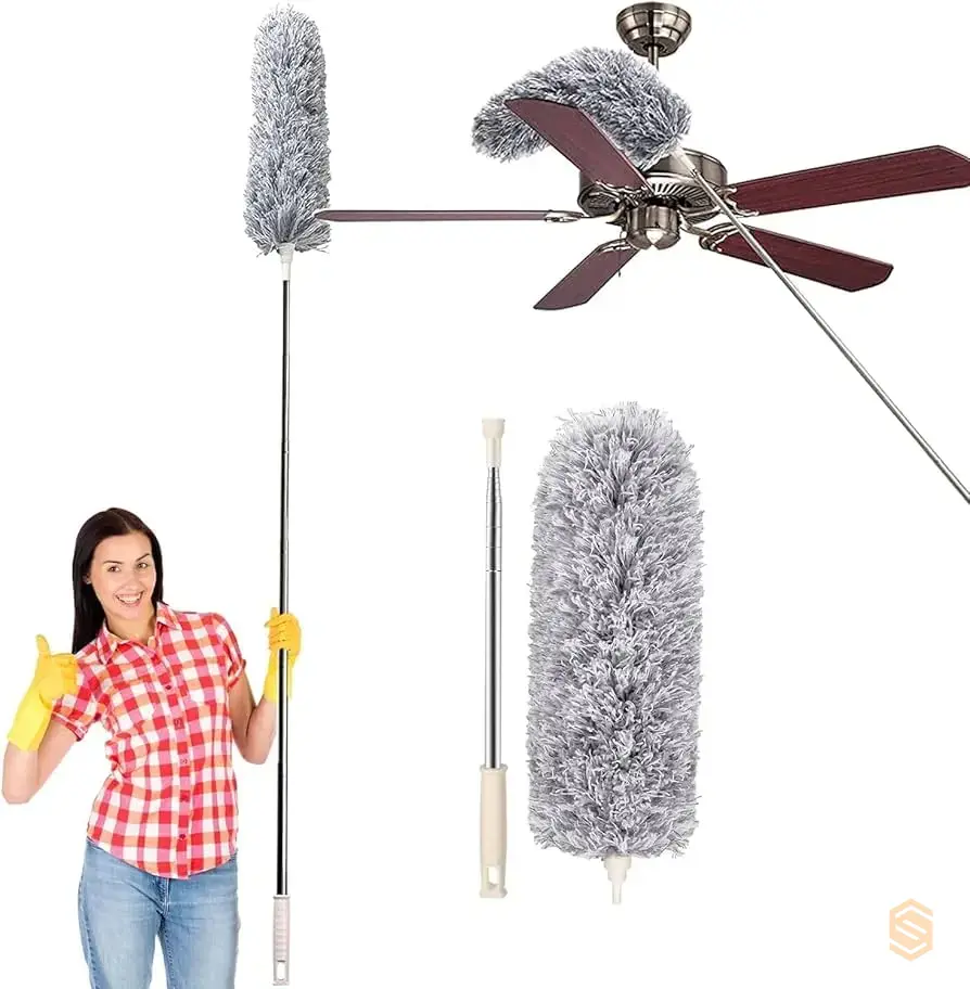 【MICROFIBER & STAINLESS STEEL POLE】: The fan duster is made of microfiber materials with extendable handle which does not rust and has a long life.