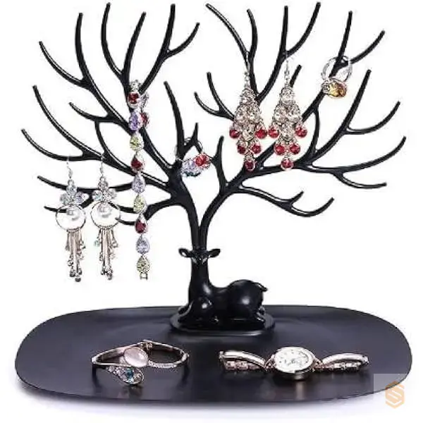 Size:- 251522cm /9.85.99inches. Jewelry space-saving holder, it's also a stylish, sophisticated and award-winning piece of art.Each branch on this tree-shaped hanger can be used to give each of your favorite necklaces, bracelets, and rings their own spot when they're not being use. And the dish at the bottom is great for wallet, phone, pen, cosmetics, etc.